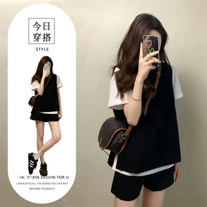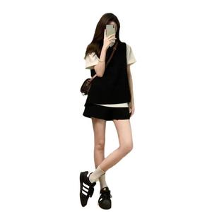 复古高级感叠穿显瘦三件套女韩版学院风白色T恤马甲休闲短裤套装