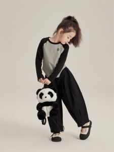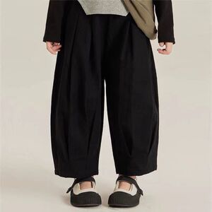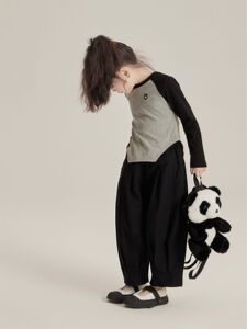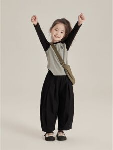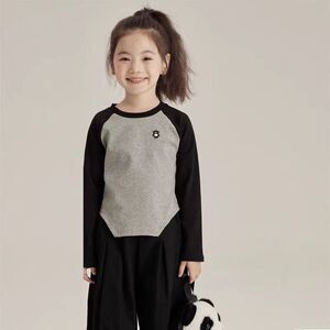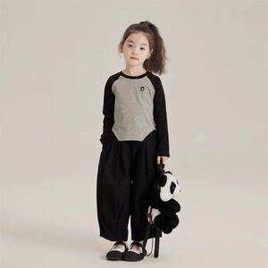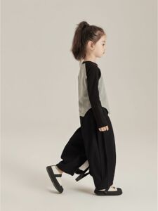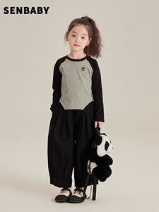 Senbaby儿童套装秋款女童洋气百搭不规则修身插肩袖T+黑色南瓜裤