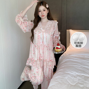 凌蕾春秋新款印色蕾丝花边甜美宽松公主风网纱睡衣套装家居服