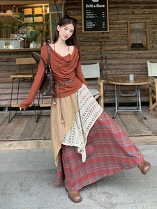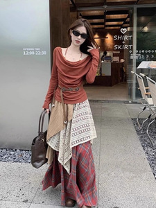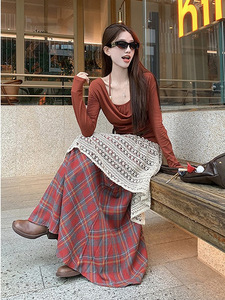 旅游穿搭套装女挂脖一字肩长袖T恤早秋季假两件格子半身裙两件套