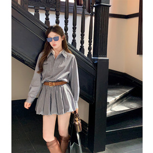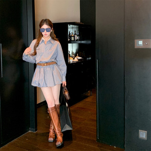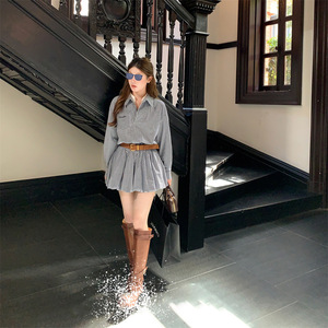 杨小卷 MIU系学院风设计感双层领格纹衬衫连衣裙女收腰花苞裙chic