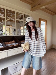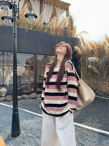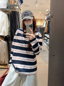 韩系慵懒风撞色条纹长袖T恤女早秋薄款防晒罩衫宽松百搭休闲上衣