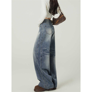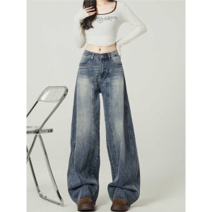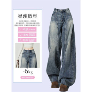 春秋垂感牛仔裤胖女装mm复古美式宽松弯刀高腰阔腿裤子女大码直筒