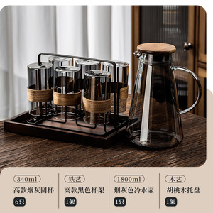 340ML烟灰木环杯x6+杯架+水壶+胡桃木色托盘✓