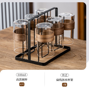 340ML烟灰木环杯x6+杯架+水壶+铁艺横纹托盘✓