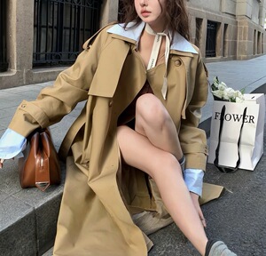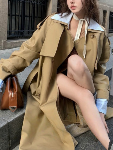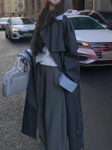 欧阳家 英伦风翻领风衣外套女秋季宽松复古系带中长款感大衣