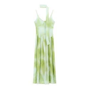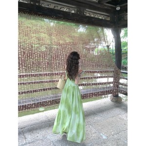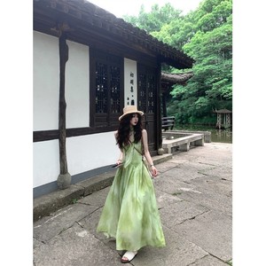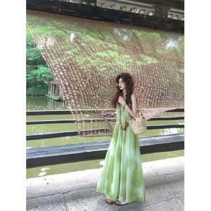 海边度假风小众别致扎染吊带连衣裙女夏季绿色清新气质大摆裙长裙
