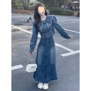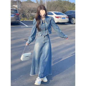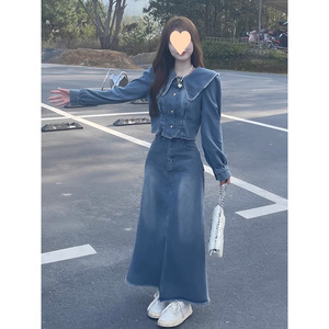 早秋新款高级感时尚减龄法式牛仔外套女搭配毛边牛仔半身裙两件套