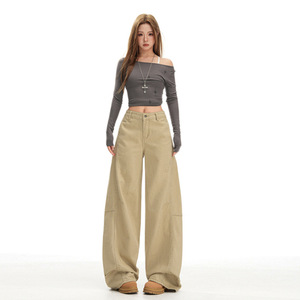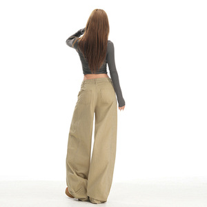 卡其色工装阔腿牛仔裤女2025新款秋季宽松设计感美式直筒弯刀裤子