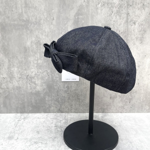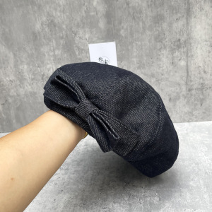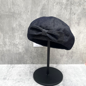 新款甜美双层蝴蝶结贝雷帽女秋冬深牛仔色画家帽潮质感八角南瓜帽