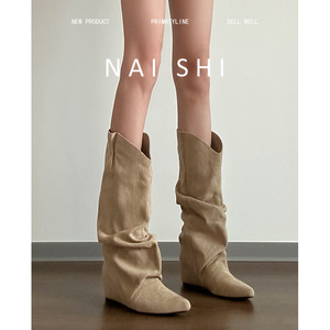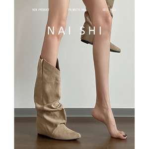 羊皮版!棕色西部牛仔靴百搭废土风堆堆靴女内增高显瘦复古长靴
