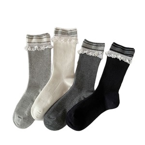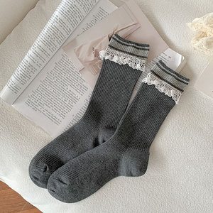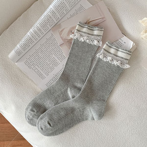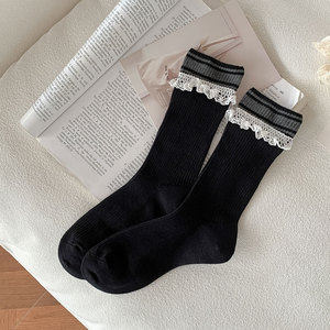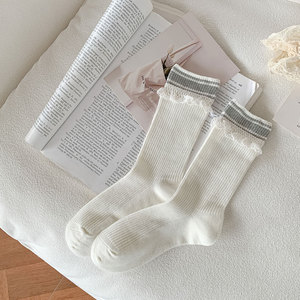 蕾丝袜子女中筒袜秋冬miu少女风棉质堆堆袜配小皮鞋条纹花边长袜