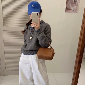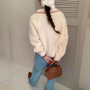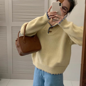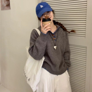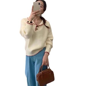 秋冬新款宽松外穿软糯针织衫设计感小众穿绳翻领牛角扣套头毛衣女