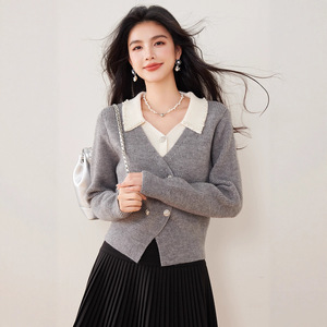 灰色假两件针织开衫女春秋2025新款设计感撞色翻领毛衣外套短上衣
