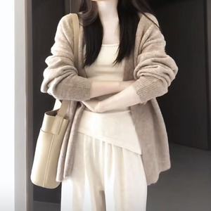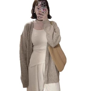 复古咖色宽松长袖毛衣女春季新款慵懒风外搭中长款小众针织开衫潮