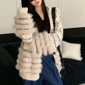 秋冬高级感仿狐狸毛亮丝条纹韩系中长宽松显瘦毛衣慵懒风外套女