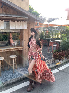 度假风红色格子长袖衬衫女夏季不规则开叉半身长裙两件套