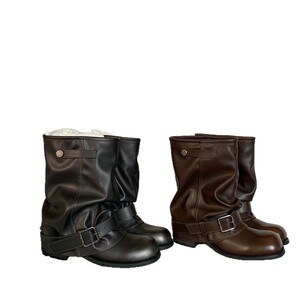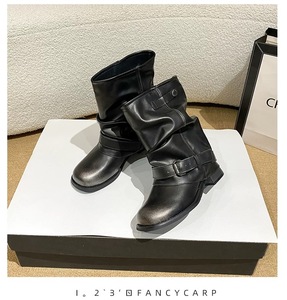 2025新款西部牛仔靴女褶皱堆堆黑色圆头复古粗跟骑士靴女中长筒靴