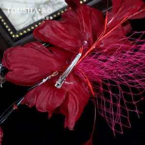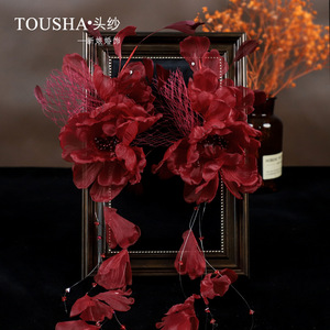 新款新娘头饰酒红色花朵流苏对夹超仙羽毛飘带礼服敬酒服结婚配饰