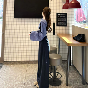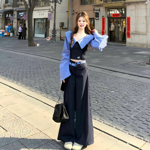 设计感小众韩系一字肩套装女高级感拼接气质穿搭2025秋衬衫阔腿裤