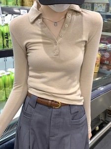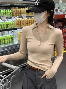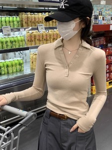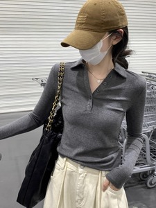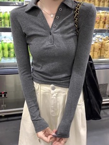 春秋正肩polo领纽扣设计感长袖T恤女内搭修身显瘦气质花灰色上衣