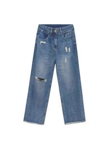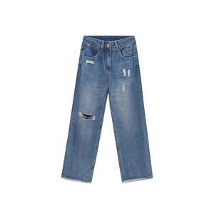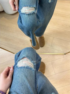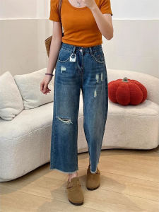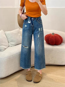 蓝色九分直筒破洞牛仔裤女秋季大码胖mm复古薄款宽松显瘦阔腿裤子