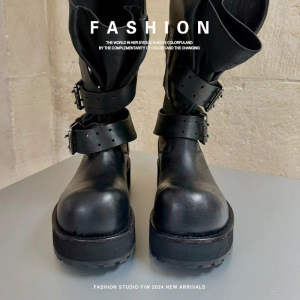 牛皮毒液增高机车靴束口厚底靴大筒围扣新款复古皮带春夏巴家朋克