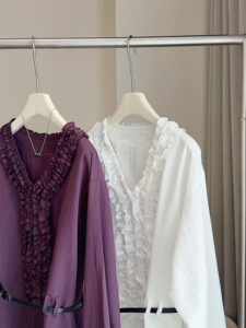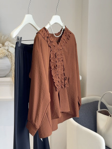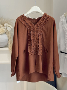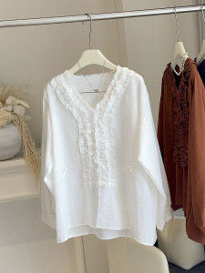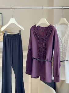设计感木耳花边拼接长袖V领白衬衫女秋季2025收腰显瘦衬衣送腰带
