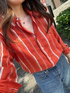 敲显白 橘红色法国亚麻混纺提花落肩休闲款长袖衬衫女 亚麻