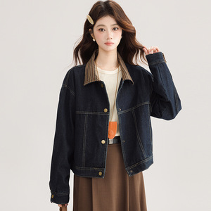 2025秋季新款韩版高级感深蓝色撞色翻领格子拼接牛仔短外套女夹克