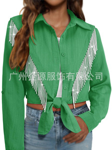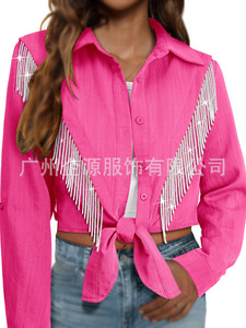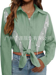 跨境欧美2025亚马逊秋季新款长袖流苏衬衫翻领纯色短款系带衬衣女