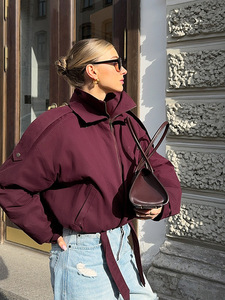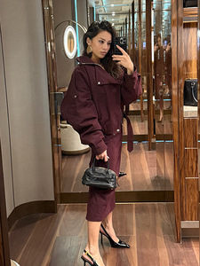 翻领休闲短款夹克-酒红色
