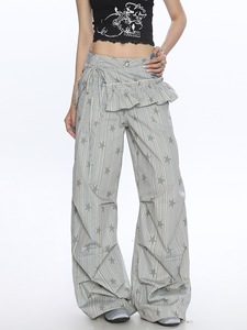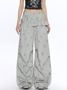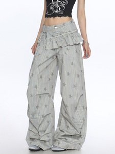 美式条纹星星工装裤女春秋季新款宽松休闲褶皱阔腿拖地裤带屁帘潮