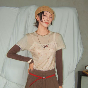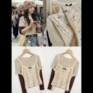 【现货秒发】南油品质2025早秋新款刺绣叠穿蕾丝吊带甜美长袖T恤