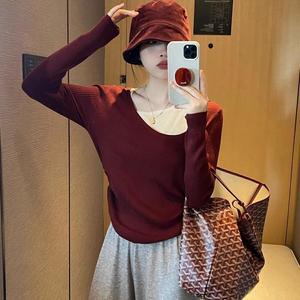 大码女装胖mm穿搭慵懒风显瘦假两件拼接撞色小众设计感针织上衣女