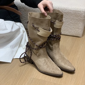 复古粗跟棕色绒面中筒堆堆靴女2025年新款瘦瘦靴春秋单靴西部短靴