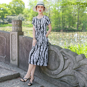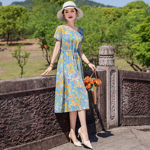 2025夏季新款棉绸连衣裙女收腰显瘦外穿短袖圆领人造棉时尚碎花裙
