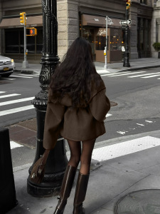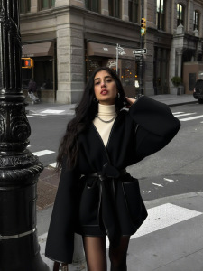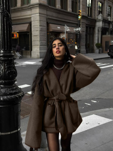 现货欧美跨境2025秋冬季女装口袋外套气质优雅复古腰带中长大衣
