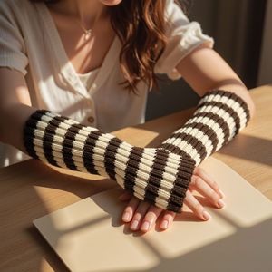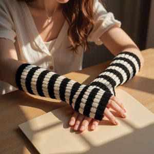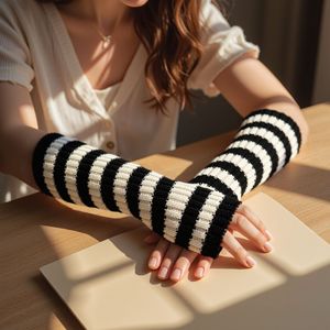 跨境双拼色针织条纹毛线防寒保暖装饰袖套手套中长款露指臂套袖子