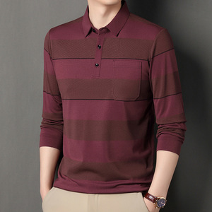 跨镜外贸中年男士长袖T恤秋季新款翻领条纹真口袋打底T恤衫男上衣