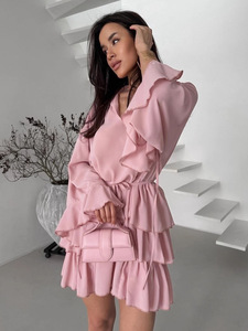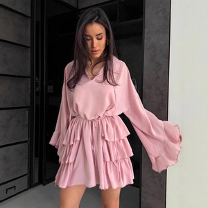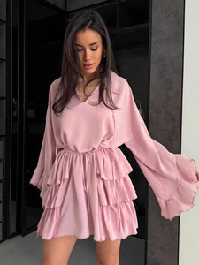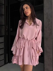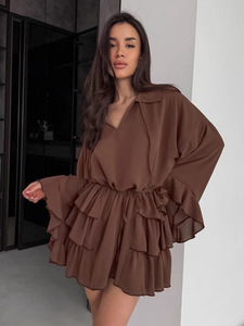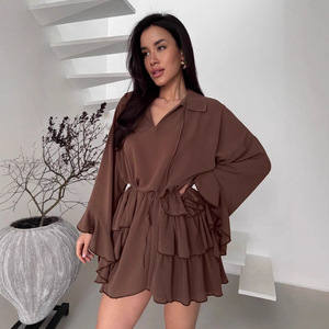 速卖通气质翻领荷叶边雪纺连衣裙女2025秋季设计感收腰A字裙短裙