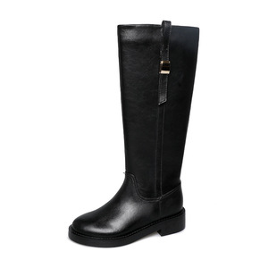 简约高级感牛皮金属扣骑士靴2025秋冬粗低跟圆头真皮高筒长靴子女
