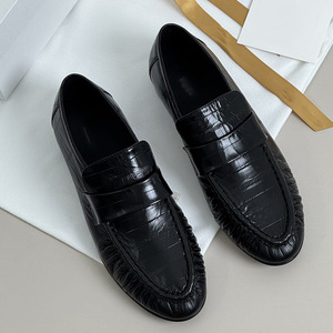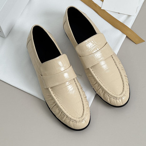 高端the小众设计感真皮复古圆头牛皮褶皱低跟单鞋百搭row乐福鞋女