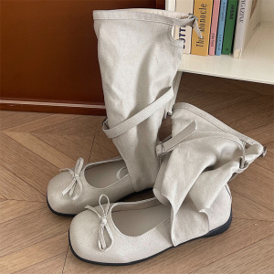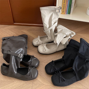 圆头浅口蝴蝶结凉靴女2025新款复古镂空中筒短靴平底芭蕾舞时装靴