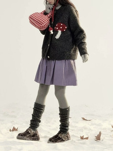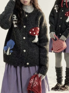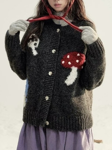 10羊毛彩色蘑菇印花针织开衫外搭女秋冬韩系新款复古宽松毛衣外套