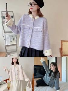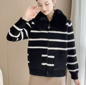 秋冬时尚撞色条纹棒球领拉链开衫毛衣女时尚通勤长袖针织衫外套