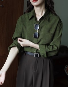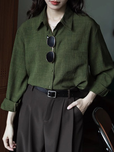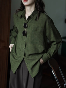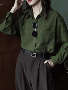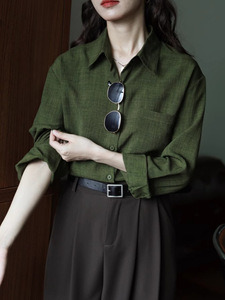 绿色设计感内搭宽松复古港味纯色长袖衬衫女显瘦秋季新款衬衣上衣
