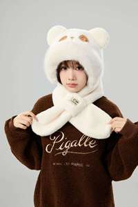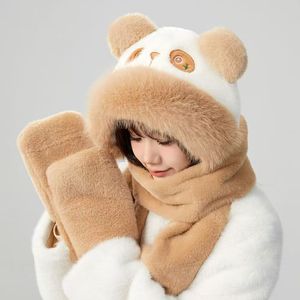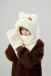 可爱卡通熊猫帽子围巾手套一体女秋冬毛绒保暖加绒加厚帽子三件套
