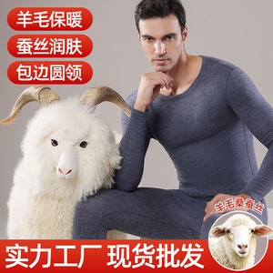 秋冬季德绒男士保暖内衣套装加绒加厚圆领羊毛蚕丝秋衣秋裤大码内