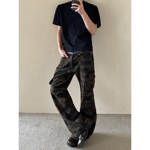 美式复古水洗迷彩牛仔裤男女高街vibe风宽松直筒阔腿拖地长裤子潮